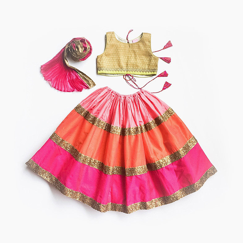 Colorful lehenga with gold brocade, cut out blouse perfect for any festive occasion!