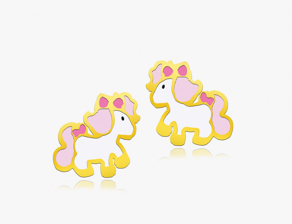 Once upon a time there was a pony by the name of Polly. She had a thick cascading shiny mane and a striking bushy tail. She always wore a pretty pink bow to a birthday party. Party with her in 18 Kt Gold and tones of pink enamel.