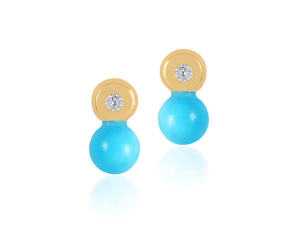 A beautiful round gold case for 0.03 carat diamonds with two 4 mm turquoise balls below, in 18 kt gold. They also come in a colourful tin box with a certificate of authenticity making it a great gift.
